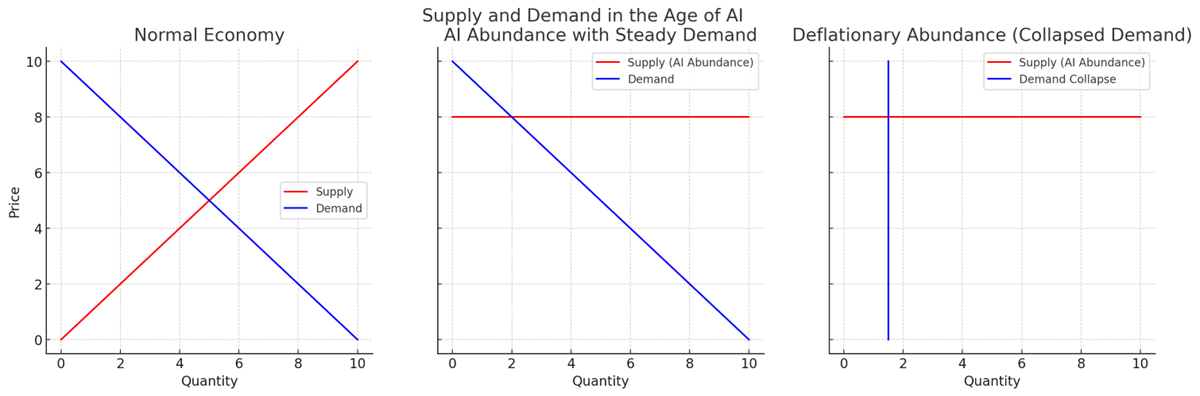 Figure 1. Three versions of supply and demand under AI. The right panel illustrates Deflationary Abundance—abundant supply with collapsed demand.