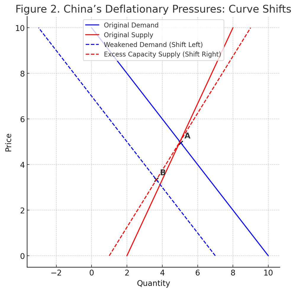 Figure 2. China’s deflationary pressures: supply shifts right (capacity), demand shifts left (weak confidence), moving equilibrium from A (higher prices/quantities) to B (lower prices/quantities).